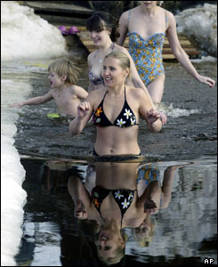اهالی مسکو از آب شدن بخشی از یخ های روی رودخانه مسکو استفاده کرده و برای شنا وارد آن می شوند.