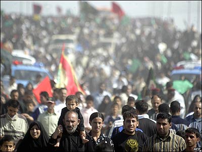 نمازگزاران شیعه در راه رفتن به مسجدی در جنوب بصره