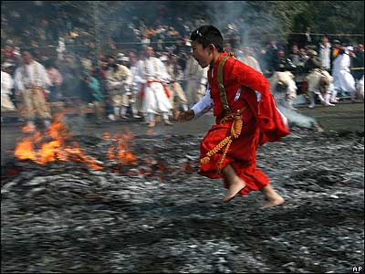 پسری ژاپنی در جشنواره "راه رفتن بر روی آتش" در کوه "تاکااو" در نزدیکی توکیو. این جشنواره به منظور دعا کردن برای صلح جهانی، امنیتی و خوشبختی برگزار می شود