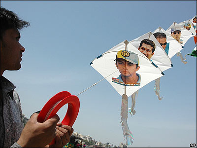 جوانی هندی در حال به پرواز در آوردن بادبادکی با چهره بازیکنان تیم ملی کریکت هند بر روی آن. از امروز جام جهانی کریکت در احمد آباد هند شروع خواهد شد