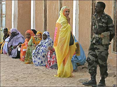 زنان موریتانی منتظر در صف انتخابات سراسری این کشور. گفته می شود این اولین انتخابات آزادی است که در تاریخ این کشور برگزار می شود
