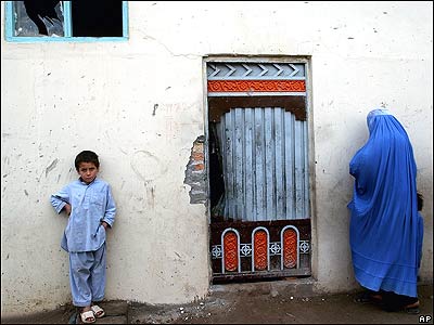 زن و پسری افغان در مقابل خانه ای در شهر جلال آباد. روزگذشته این شهر شاهد درگیرهایی بین نیروهای آمریکایی و نیروهای وابسته به القاعده بوده است