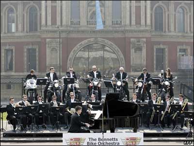 ارکستر "بنتس بايک" به رهبری استيون مونتاگ مقابل "تالار سلطنتی آلبرت" در لندن در فضای باز به اجرای برنامه پرداختند. اين گروه که ترکيبی از نوازنده ها و موتور سواران است، به منظور کمک به ارتقای احتياط موتورسواران در خيابان برنامه اجرا می کند.
