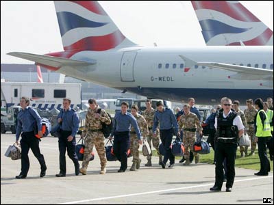 روز پنجشنبه، 5 آوریل، هواپیمای حامل پانزده عضو نیروی دریایی و واحد تفنگداران دریایی بریتانیا حدود 11 صبح به وقت گرینویچ در فرودگاه هیثرو لندن به زمین نشست و این افراد بلافاصله با هلی کوپترهای نیروی هوایی به یک پایگاه نظامی واقع در جنوب غرب این کشور انتقال یافتند و انتظار می رود در این محل به خانواده های خود ملحق شوند.
