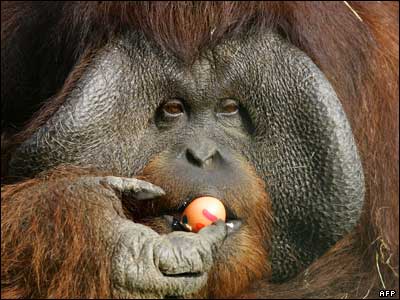 یک اورانگوتان در حال خوردن تخم مرغ در یک پارک حیوانات در هلند.