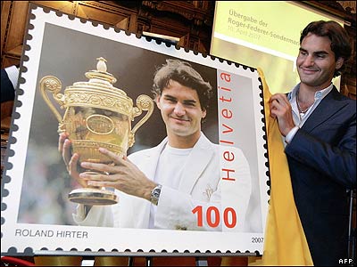 راجر فدرر، تنیسور شماره یک جهان که سوئیسی است در حال پرده برداری از یک نمونه بزرگ تمبر پستی سوئیس که عکس او بر روی آن دیده می شود
