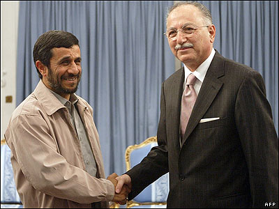 محمود احمدی نژاد، رئیس جمهوری ایران در حال دست دادن با اکمل الدین احسان اوغلو، دبیر کل سازمان کنفرانس اسلامی
