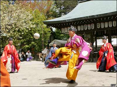 ژاپنی ها در یک زیارتگاه در کیوتو، با لباس های سنتی در حال بازی "کماری" هستند. در کماری، بازیکنان برای بالا انداختن توپ فقط از پای راست خود استفاده می کنند