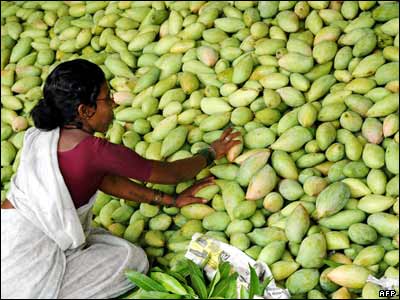 یک کشاورز زن هندی، در یک بازار عمده فروشی میوه در حیدرآباد، منگوهای خود را در معرض فروش قرار می دهد. امسال برای اولین بار پس از 18 سال، مگنوهای هندی وارد بازارهای آمریکا می شوند