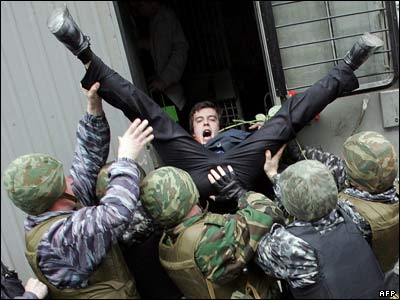 پلیس روسیه در حال دستگیر کردن یک فعال سیاسی مخالف در جریان راه پیمایی در مرکز مسکو