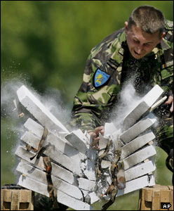 یک سرباز رومانیایی در حال نمایش هنرهای رزمی در روز نیروی زمینی ارتش این کشور که در شهر بخارست برگزار شد. رومانی عضو پیمان تاتو است و تعدادی از نیروهای نظامی این کشور در افغانستان و عراق حضور دارند.