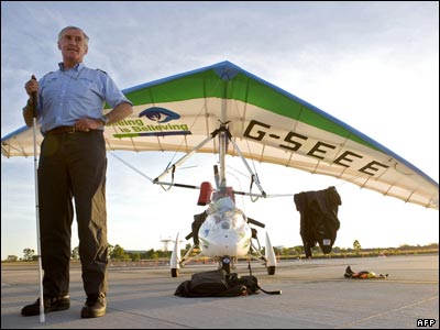 هیلتون باربر، خلبان نابینای بریتانیایی، در فرودگاه شهر داروین در شمال استرالیا. او موفق شد که مسیر لندن تا داروین را با هدف حمایت از یک موسسه خیریه به همراه یک کمک خلبان طی کند.