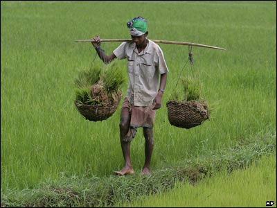 کشاورزی در حال حمل محصولش در مزرعه ای در خارج از شهر گواهاتی در شرق هند. صنعت کشاورزی منبع درآمد 115 میليون خانوار هندی و يا 70 درصد جمعيت اين کشور است. |