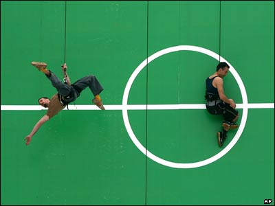 نمايش دو آکروبات در شهر آتن. پایتخت یونان قرار است روز 25 مه ميزبان فينال ليگ قهرمانی باشگاهی اروپا باشد.