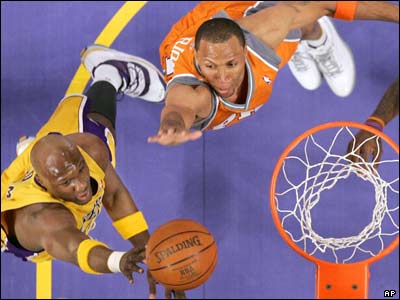لامار ادوم از لس آنجلس لیکرز توپ را وارد سبد فونیکس سانز می کند. این بازی با نتیجه 95 بر 89 به سود لیکرز به پایان رسید. |