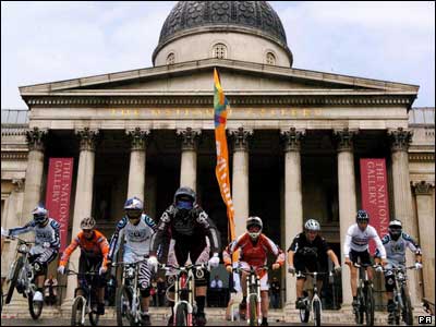 تعدادی از دوچرخه سواران کوهستانی بریتانیا از پله های مقابل موزه نشنال گالری در میدان ترافالگار لندن پایین می آیند. این مراسم برای معرفی دوچرخه های جدیدی برگزار شده بود که قرار است در مسابقات جهانی دوچرخه سواری کوهستانی در اسکاتلند برگزار می شود، استفاده شوند.