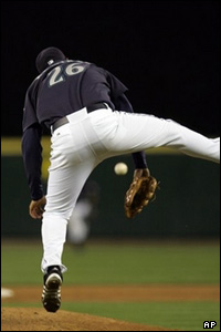هوراشیو رامیرز، از تیم سیاتل مارینرز، موفق به گرفتن توپ امیل براون از تیم کانزاس سیتی رویالز نمی شود.