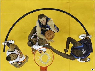 صحنه ای از دیدار دالاس ماوریکز و گلدن استیت واریورز؛ درک نوویتزکی، سانتر آلمانی تیم ماوریکز توپ را به سمت سبد پرتاب می کند. واریورز این بازی را 109 بر 91 برد.
