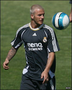 دیوید بکام، هافبک انگلیسی رئال مادرید، با آرایش جدید موی خود در تمرین حضور پیدا کرده است. بکام هفته پیش 32 ساله شد.