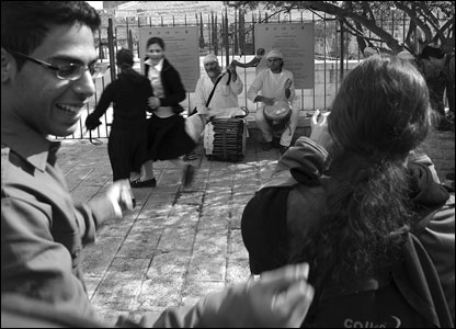 6 فوریه 2007 مسلمانان به تجمعی صلح آمیز نزدیک باب المغاربه دست زدند. پلیس های اسرائیلی و تظاهرکنندگان فلسطینی به رقص شکم یک یهودی اورتدوکس می خندند.