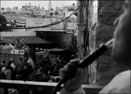 آدم، جوان 22 ساله فلسطینی، در قهوه خانه ای نزدیک دروازه دمشق قلیان می کشد و رفت و آمد مردم در شنبه بازار را تماشا می کند. آدم هم از کار اسرائیلی ها عصبانی است: "وقتی همه علیه این کار دست به مبارزه بزنند من هم به آنها خواهم پیوست. اما در حال حاضر چون در اسرائیل کار می کنم نمی توانم از پس دردسرهای دستگیری توسط پلیس اسرائیل بر آیم."