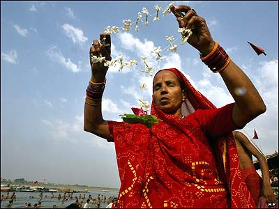 زنی هندو در کنار رود گنگ در شهر الله آباد هند که از مهترین مراکز مقدس آئين هندو محسوب می شود، به عبادت مشغول است. |