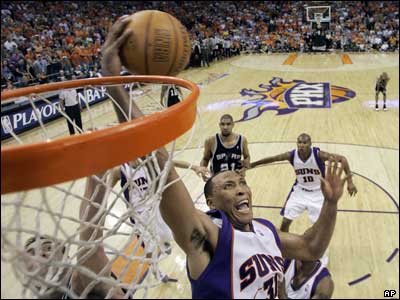 شان ماریون از تیم فونیکس سانز از حمله سن آنتونیو اسپورز به سمت سبد این تیم دفاع می کند. دیدار بین دو تیم، از رقابتهای بسکتبال حرفه ای آمریکا NBA در ورزشگاه یو اس ایرویز در فینیکس برگزار شد. اسپرز 88 بر 85 سانز را شکست داد.