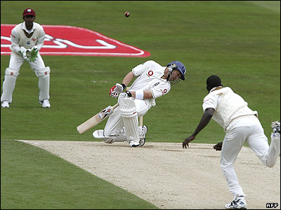 مت پريور (وسط) از انگلستان در دومين روز مسابقه کریکت بين انگلستان و هند غربی که در لیدز جریان دارد. |