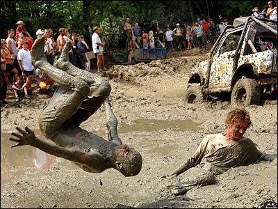 مردان مجارستانی در جریان فستیوال سالانه "جاده خاکی" داخل گل و لای می پرند. |