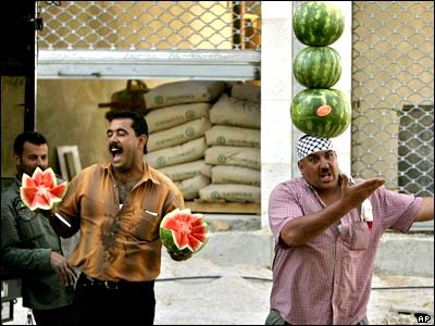 هندوانه فروش فلسطینی در شهر رام الله در کرانه باختری در حال جلب مشتری است.