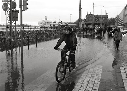 پتری سولونن، از هلسینکی فنلاند این تصویر را فرستاده است. او می گوید: "فصل بی پایان زمستان در فنلاند غیرعادی شده است: هوای بسیار ملایم، توفان های پی در پی که باعث شده سطح آب دریا به میزان دو متر بالا بیاید. مسئولان شهر هلسینکی در مناطق ساحلی سد برپا کرده اند که فایده چندانی نداشته و آب دریا وارد خیابان ها شده است."