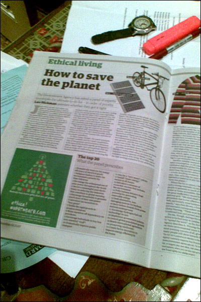 | | مجلات و نشریات مختلف مملو از مقالات و مطالب متنوع درباره زندگی منطبق با اصول حفظ محیط زیستند. معمولا صفحه ای مختص این موضوع در ضمیمه روزنامه های خبری و جدی دیده می شود. این عکس از یکی از همین صفحه ها در ضمیمه روزنامه گاردین چاپ بریتانیاست که عنوان آن "زندگی روی اسلوب محیط زیستی است." |