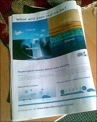 | | آگهی مدل هیبرید تویوتا در یکی از مجلات انگلیسی زبان چاپ لندن - در حالی که بسیاری از تبلیغات تصویری خودروها می خواهد به بیننده حس تمول، جاذبه جنسی، سرعت، ... را القا کند، می بینیم که تبلیغات مربوط به خودروهایی که با هدف کاهش انتشار گازهای گلخانه ای به بازار ارائه شده است شامل متن های مفصل می شود و در واقع به نوعی سعی دارد خریداران را همزمان با ترغیب به خرید این نوع خودروها، ارشاد هم بکند |