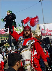 نمایش نبرد عاشورا در مراسمی با لباس های رزم در کربلا