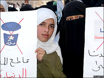اين دختران يمنی پلاکادرهايی در دست دارند که در آن ها تحريم کالاهای دانمارکی خواسته شده است.