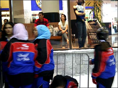 مردم با لباسهای تابستانی از پشت شيشه به کسانی نگاه می کنند که لباسهای گرم پوشيده اند و بر روی برف راه می روند.