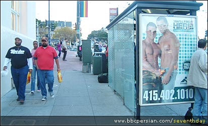 : تبليغات شهری درايستگاه های اتوبوس نيز برای افراد همجنسگرای مرد طراحی شده است.پرچمی که روی تيرانتهای تصوير به رنگ های آبی زرد وقرمز ديده می شود، پرچم رسمی اين افراد به شمار می رود. |