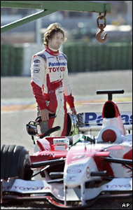 انتظار يارنو ترولی راننده ايتاليايی تيم تويوتا در تمرينات تيم های فرمول يک در والنسيا برای انتقال اتومبيلش به جايگاه: او پس از 105 دور چهاردمين راننده سريع روز تمرينات شد.