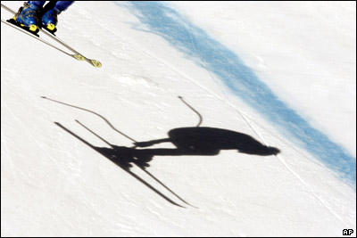 سايه اسکی باز ايتاليايی کريستيان قدينا هنگام تمرين قبل از مسابقات جهانی آلپين در چامونيکس فرانسه