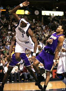 خطای کوامه براون از لوس آنجلس ليکرز بر روی جاش هووارد از دالاس در مسابقه بين دو تيم، شب گذشته (هفتم فوريه) که در دالاس برگزار شد. این مسابقه با نتيجه 87-102 به سود دالاس تمام شد.
