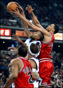 تايسون چندلر از تيم شيکاگو بولز در تلاش گرفتن توپ از دست کنی توماس مهاجم تيم ساکرامنتو کينگز. مسابقه بين دو تيم شيکاگو بولز و ساکرامنتو شب گذشته در ساکرامنتو کاليفرنيا، با اختلاف 80-98 به سود تيم ساکرامنتو تمام شد.