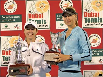 جاستين هنين از بلژيک (چپ)، با پيروزی 0-2 بر ماريا شاراپووا از روسيه قهرمان تورنومنت تنيس آزاد زنان دوبی شد.