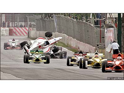 تصويری از تصادف شيمودا از تيم ژاپن در ابتدای مسابقه A1 مکزيک: الکساندر پرمت از فرانسه پس از پيروزی در جام جهانی ورزشهای موتوری که در مکزيک برگزار شد، با کسب 10 امتياز و مجموع 153 امتياز به رسيدن به قهرمانی کل اين مسابقات نزديک تر می شود.