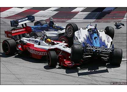 تصادف بين 'پل تريسی'، 'اوريال سرويا' و 'ماريو دومينگز' در مسابقات سرعت آمريکا معروف به ChampCar در لانگ بيچ آمريکا
