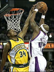 صحنه ای از کوآرتر چهارم مسابقه بين تيم ساکرامنتو کينگز و سوپرسونيک از سری مسابقات بسکتبال حرفه ای آمريکا NBA، که با پيروزی سوپر سونيک در ساکرامنتوی کاليفرنيا برگزار شد.