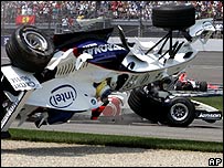 فليپه مسا راننده تازه وارد تيم فراری در مقام دوم و ژان کارلو فيسيکلا از تيم رنو سوم شد. در همان مراحل اوليه اين مسابقه در پيچ اول هفت اتومبيل با هم برخورد کردند و از دور مسابقه خارج شدند، که باعث شد تا اتومبيل ايمنی از جايگاه بيرون بيايد.(اتومبيل ايمنی زمانی از جايگاه بيرون می آيد که اتومبيلی بر اثر تصادف، در مسير اتومبيل ها در پيست قرار بگيرد و برای رانندگان در حال مسابقه ايجاد خطر کند. مسابقه تا زمانی که اتومبيل های تصادف کرده، توسط جرثقيل از صحنه تصادف خارج نشوند، پشت سر اتومبيل ايمنی ادامه پيدا خواهد کرد.) ترمز شديد رايکونن از تيم مکلارن بنز باعث برخورد هم تيمی اش، مونتويا با عقب اتومبيل او شد، در همين موقع هايدفلد از تيم بی.ام.و و جنسون باتون از تيم هوندا کنترل خود را از دست داده و با دو اتومبيل مکلارن برخورد کردند که باعث شد اتومبيل هايدفلد سه بار در هوا بچرخد و به شدت با زمين اثابت کند، البته هيچ آسيب جسمی به کسی وارد نشد. رانندگان ديگری که از دور خارج شدند، اسکات اسپيد تنها راننده آمريکايی اين مسابقات از تيم توروروسو، که اميد داشت در اين مسابقه (مسابقه خانگی) امتيازی بدست آورد، کريستين کلين از ردبول ريسينگ و فرنک مونتنی از تيم سوپرآگوری بودند. در دور يازدهم، يعنی چند دور پس از ورود اتومبيل ايمنی به جايگاه، دو اتومبيل ديگر، تياگو مونتيرو(ميدلند) و تاکوما ساتو(سوپرآگوری) نيز با هم برخورد کرده و آنها هم از دور مسابقه خارج شدند.  | | | در تصادف پيچ اول مسابقه آمريکا، نيک هايدفلد از تيم بی.ام.و، سه بار در هوا چرخيد و بعد به شدت با زمين اثابت کرد. |