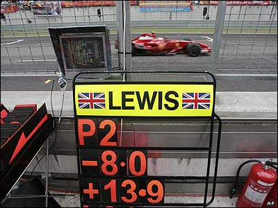 این عکس که پس از خروج همیلتون از مسابقه گرفته شده، تابلوی اطلاع رسانی این راننده را نشان می دهد که در آن مشخص شده که در مکان دوم است، هشت ثانیه با نفر اول اختلاف دارد و نفر سوم 13.9 ثانیه عقب تر از او است. همیلتون که از مسابقه خارج شده بود هیچگاه در هنگام رانندگی این تابلو را ندید.