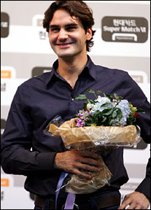 راجر فدرر خوش اخلاق و خوشحال برای اولین از سه مسابقه با پیت سمپراس وارد سئول، پایتخت کره جنوبی شد.