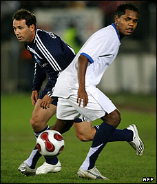 روکه جونیور، ستاره برزیلی که در تصویر میگوئل میستا پشت سر او است، گل دوم تیم زیدان را در دقیقه 44 و پس از برخورد ضربه زیدان به تیر دروازه تیم رونالدو به ثمر رساند.