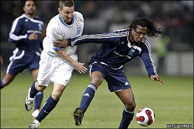 ژولیوس دوس سانتوس، در حال دفاع زیدان که در دقیقه 11 گل اول مسابقه را به ثمر رساند. دوس سانتوس خود در دقیقه 61 گل اول تیم رونالدو را زد.